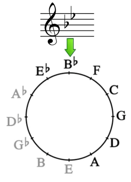 Or if we’re in Bb major – with two flats – we rotate the circle yet again until the Bb is at the top. And we have a circle of fifths in the key of Bb.