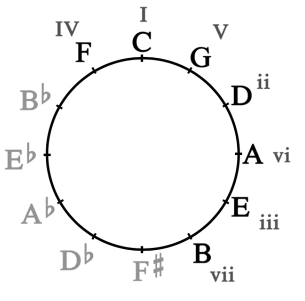 So, C is the I, D is the ii, E is the iii, F is the IV, G is the five, A is the vi, and B is the vii. The cool thing is that these labels are the same for every key.
