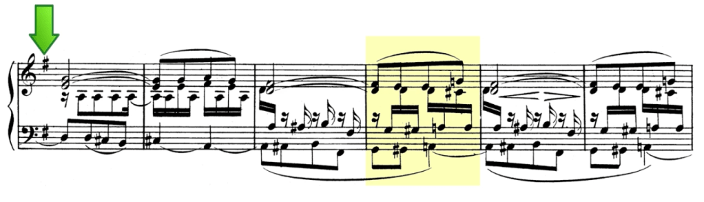 Here I have a measure from Beethoven’s Sonata Opus 14 No.2, and the one sharp in the key signature tells me that we’re in the key of G major.