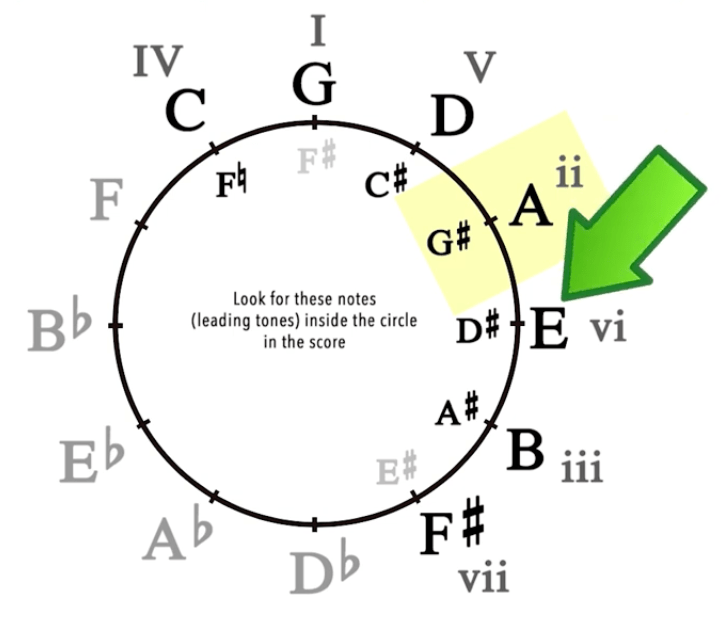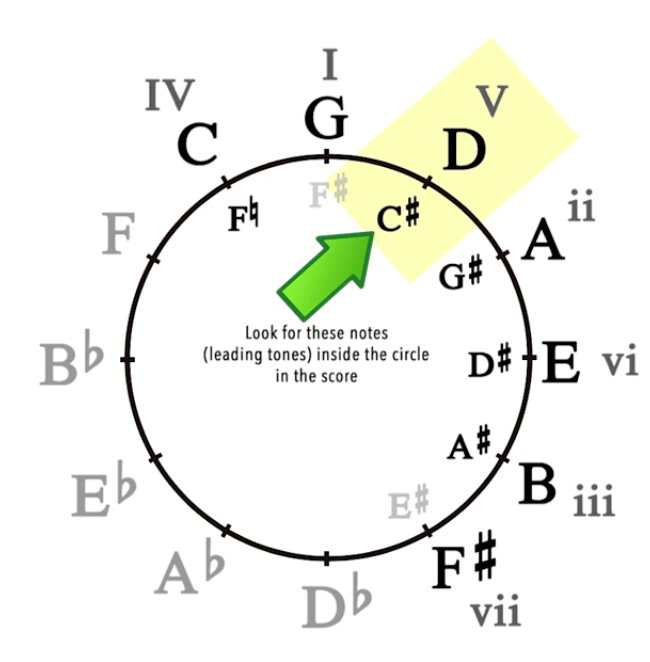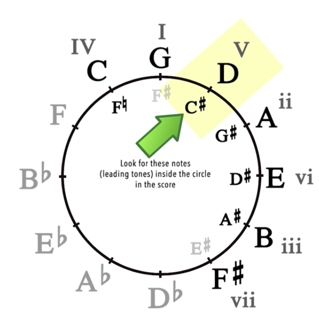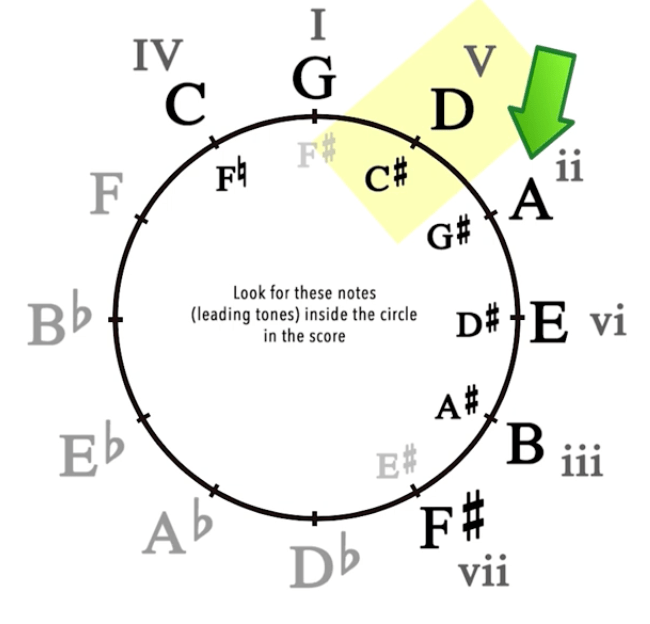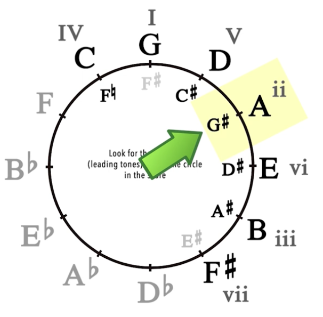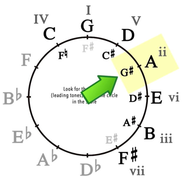 We have a couple of accidentals, and they are sharps. These are great candidates to potentially be secondary dominants. The first one is a G#. So, we look at our new and improved circle of fifths, and we look for a leading tone that’s a G#.