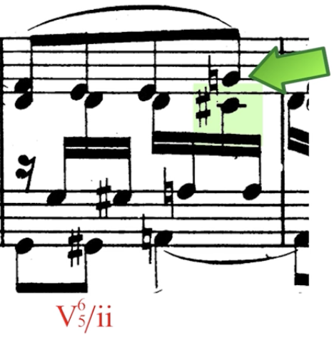 So it’s either a V/ii or a V7/ii. And there’s a D. So, that means this is an E7. So this is a V7/ii. Of course, it’s an inversion, because the lowest note is not an E. It’s a G#. So we write V65/ii. 65 because G# to E is a 6th, and G# to D is a 5th.