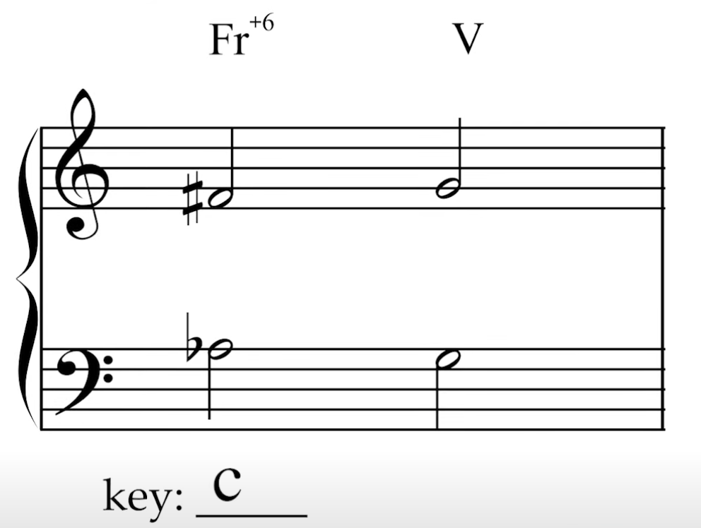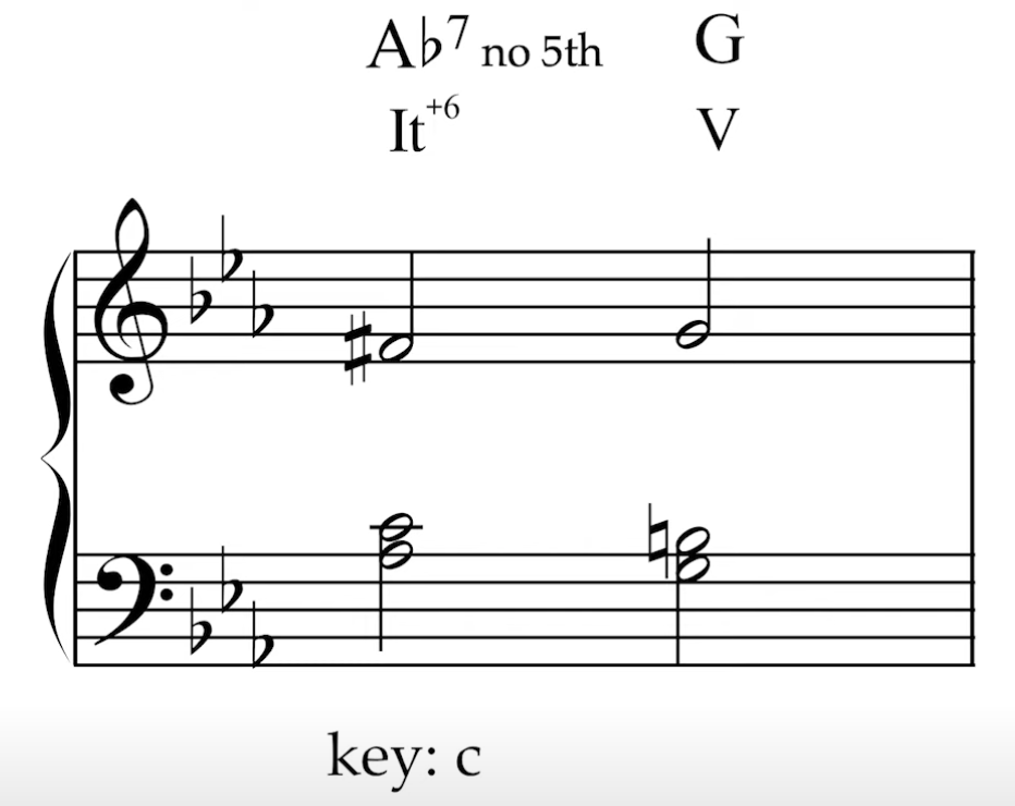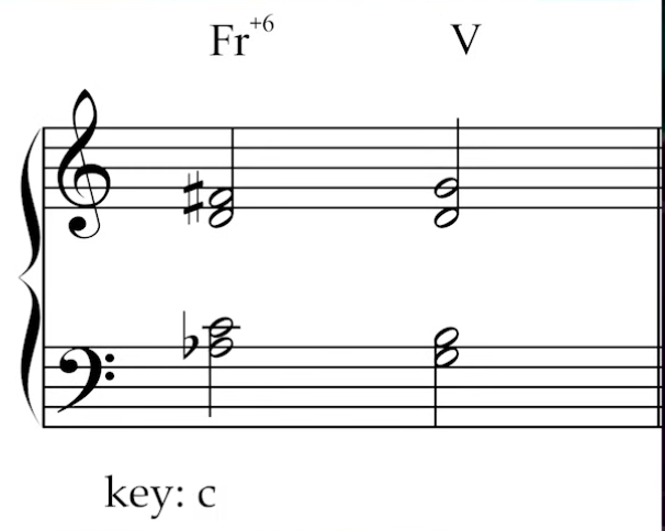 Remember this: the augmented six chord always resolves to the V of the key in octaves (or doubled unison, if we’re using an inversion of the augmented sixth chord).