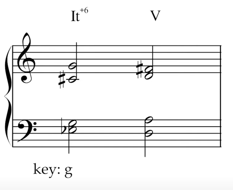 So now, we have a beautiful tension-release effect. These two notes resolve in contrary motion. By the way, in the Italian sixth we can double the 3rd of the chord — since we don’t have the Eb — and then, one C moves down to the B, and the other moves up to the D.