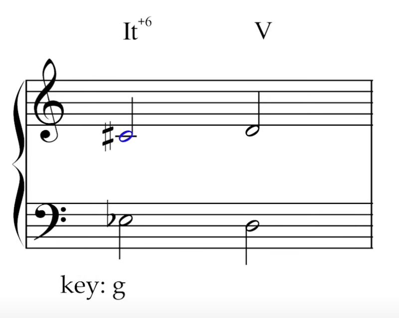 Remember this: the augmented six chord always resolves to the V of the key in octaves (or doubled unison, if we’re using an inversion of the augmented sixth chord).