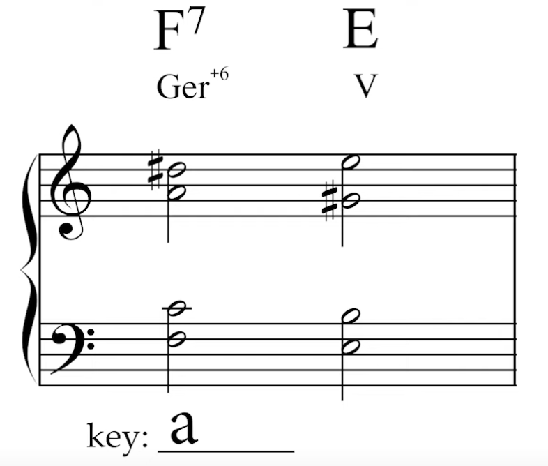 So, F has to move down to E, right? Then, E is the V of our key, which means we’re in A minor. Now we have to add the leading tone to E — which is D#. Now we add the 3rd (A) and the 5th (C). So this chord is the German augmented sixth in the key of A minor, and look: it’s an F7! It just looks weird when we write it down like this, and of course, it resolves to an E chord like this…
