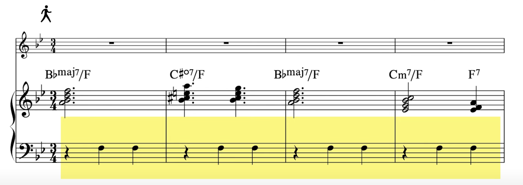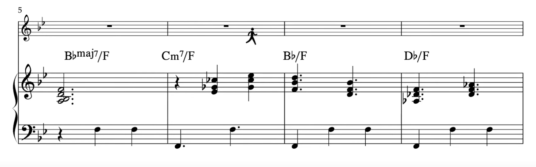 The first thing we’ll discuss is the introduction. The intro sets the tone for the entire song and is a great way to build tension and establish the key. In this arrangement, we’re using a dominant pedal point in the key of F to build tension. The dominant of our key is Bb, so we’re using the note F as a pedal point in the bass. This creates a clearly defined anchor for the listener and allows us to introduce chords that aren’t in the key, like the Db/F and C/F in the intro.