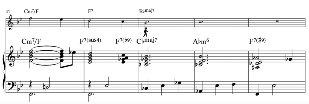 Another technique used in this arrangement is borrowing chords from the minor key. We can borrow chords from the parallel minor key to add a bit of color to the arrangement. For example, in the first line of the arrangement, we’re using the bVI chord from the Bb minor key, which is Dbmaj7.