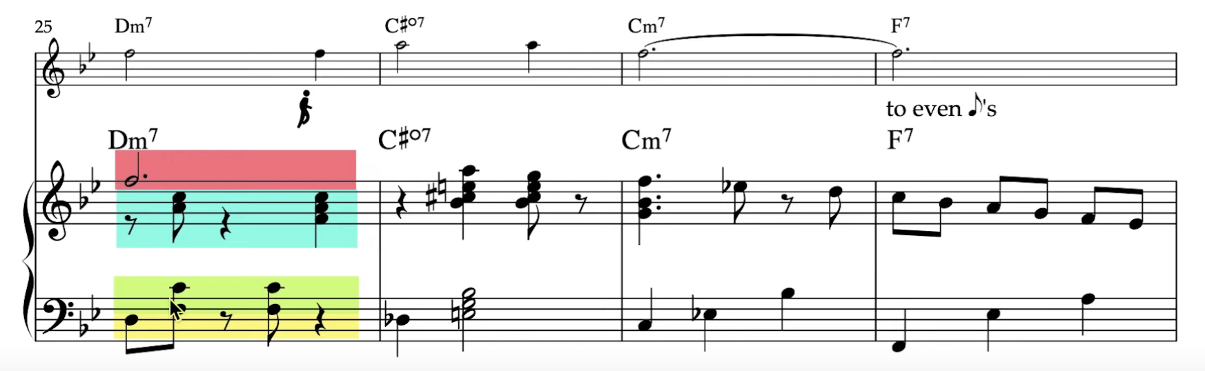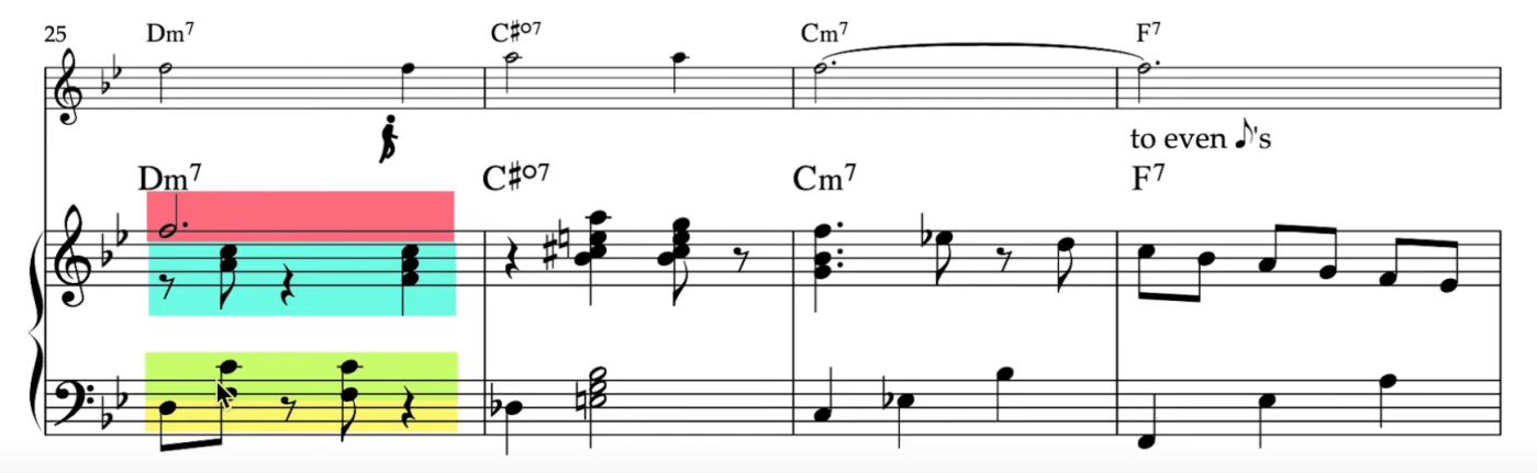 The rhythmic grid is another important aspect of this arrangement. We’re using an eighth-note subdivision to define our grid, which creates a more complex and interesting rhythmic feel. The left hand is also filling in the spaces offered up by the right hand, which creates a more clearly defined bass line.