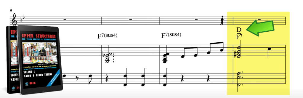 Finally, we’re using upper structure chords in this arrangement. Upper structure chords are chords that are built on top of a basic triad or seventh chord. They allow us to highlight tensions within the chord and create a unique and interesting voicing. In this arrangement, we’re using a D/F7 chord as an upper structure chord in the intro.