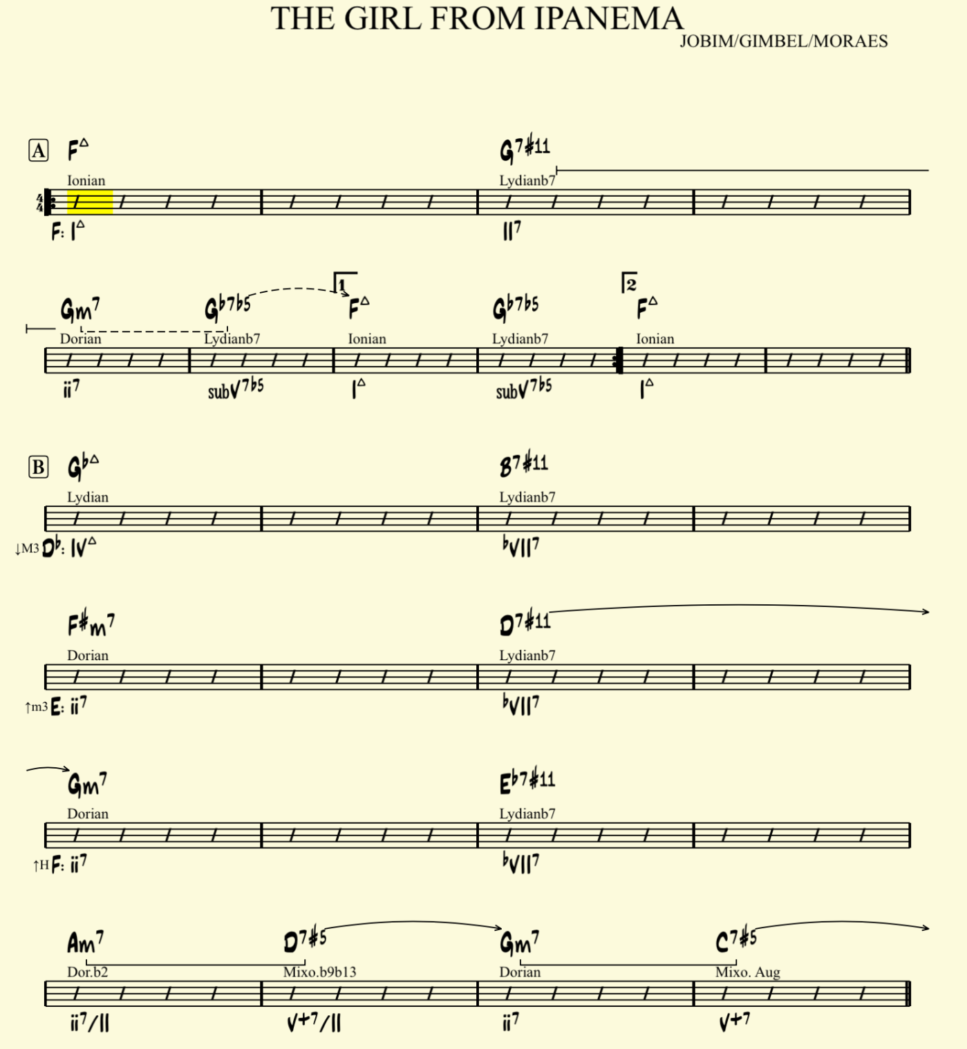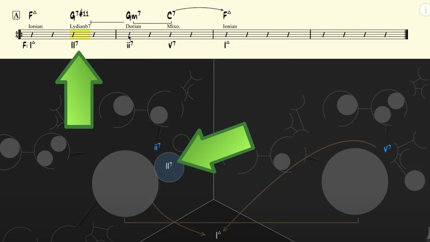But here’s where things get interesting. In “The Girl From Ipanema”, the G7 chord sounds much better when paired with the Lydianb7 scale, turning the G7 into a G7#11. This is a dominant chord with a #11, and thus turns the G7 into a II7 chord. And yes, the II7 is a real function!