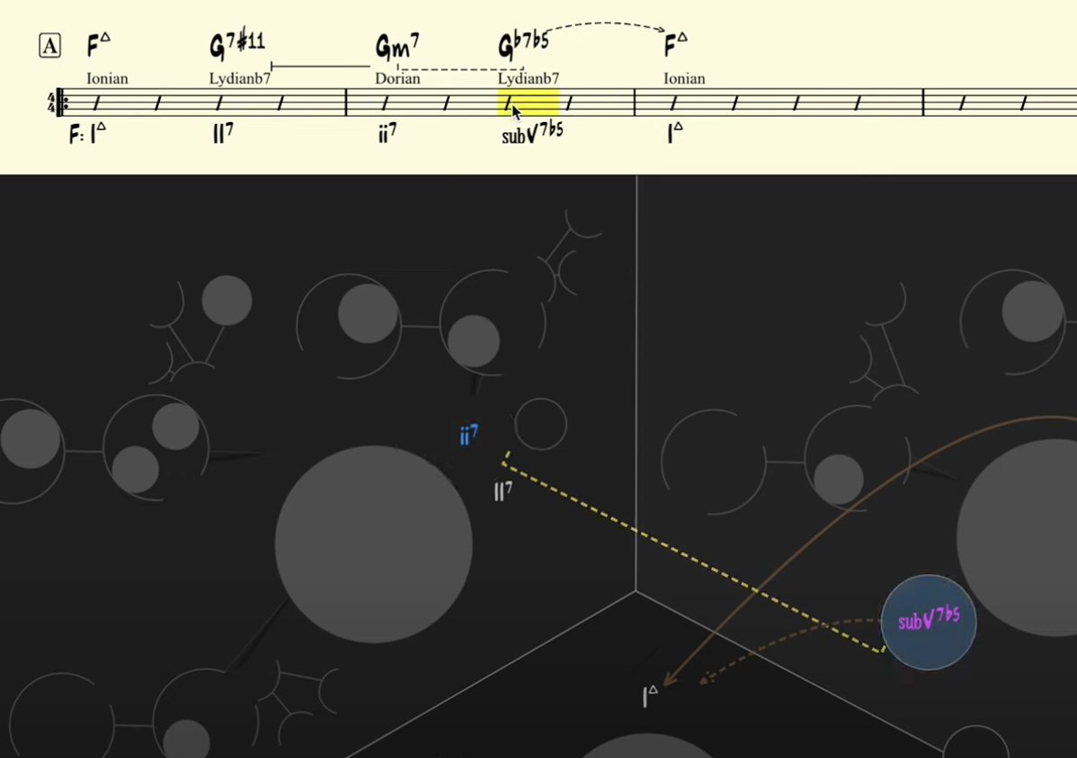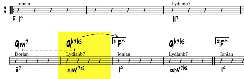 Let’s take a look at measure 6. If you listen closely, you’ll notice that the chord progression is a reharmonization of a typical 2-5-1 progression. But instead of using the V7 (C7), Jobim gets creative and replaces it with the subV7 (Gb7b5), giving us a 2-sub5-1 path. Here’s where it gets even more interesting: normally, the subV7 is paired with the lydianb7 scale, creating a 7#11 chord. However, Jobim turns the #11 into a b5, making it a chord tone, and eliminating the natural 5 altogether. This little trick adds a unique flavor to the progression and sheds light on Jobim’s treatment of dominant chords.