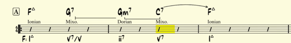 Let’s take the example of the key of F major. The C7 chord is the V7, and we can target it with its V chord, which is G7. This tonicizes the V7 chord, which then resolves to the I chord, which is Fmaj7. This gives us a standard and effective progression: I – V7/V – V7 – I.