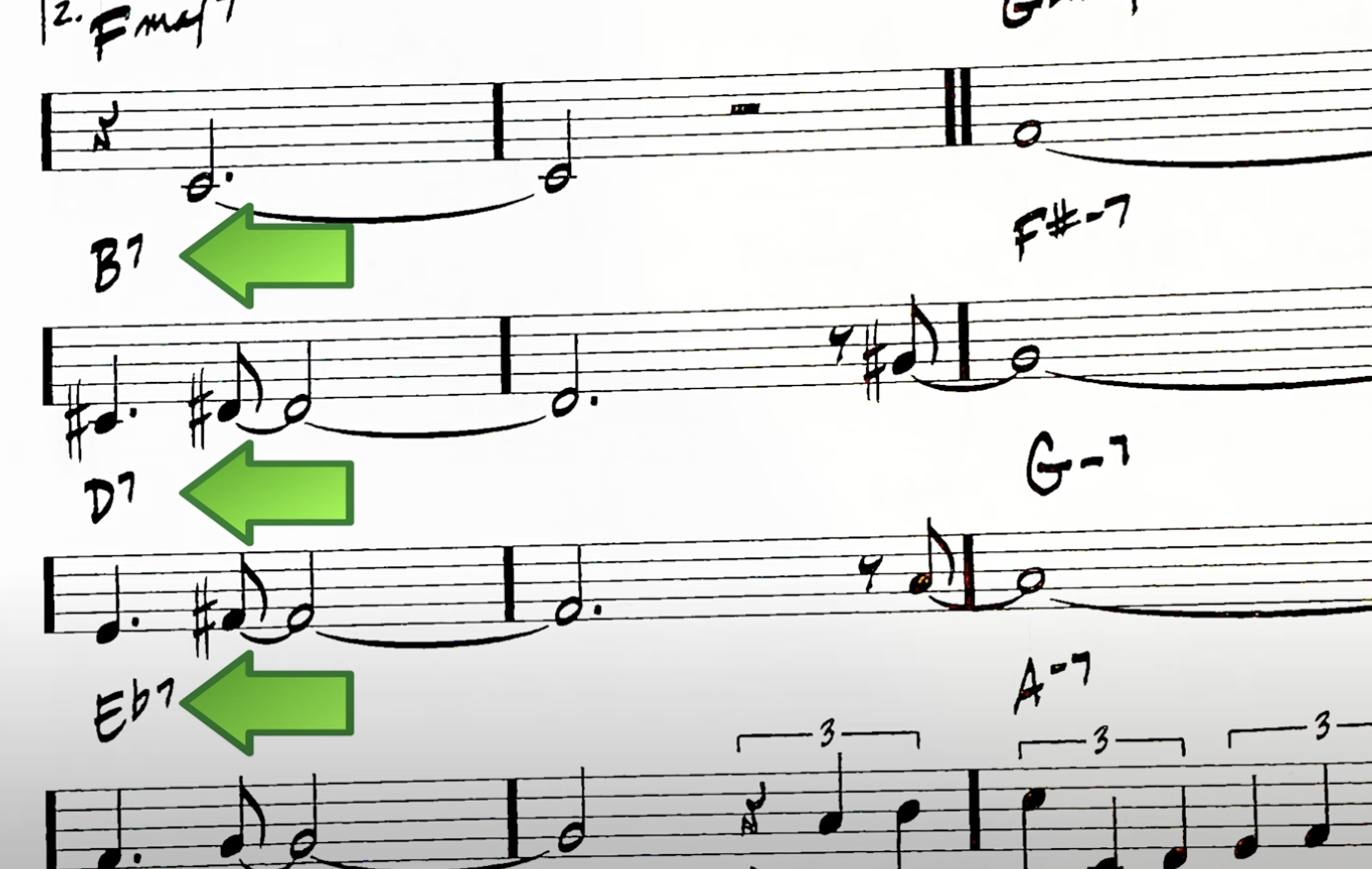 But, as we said before, Jobim takes it one step further and reharmonizes the V7 (C7) chord with the subV7 (Gb7), and reinterprets the #11 as the b5 turning the Gb7 into a Gb7b5. This reharmonization turns this: (Imaj7 – II7#11 – iim7 – V7 – Imaj7) and turns it into this: (Imaj7 – II7#11 – iim7 – subV7b5 – Imaj7.)