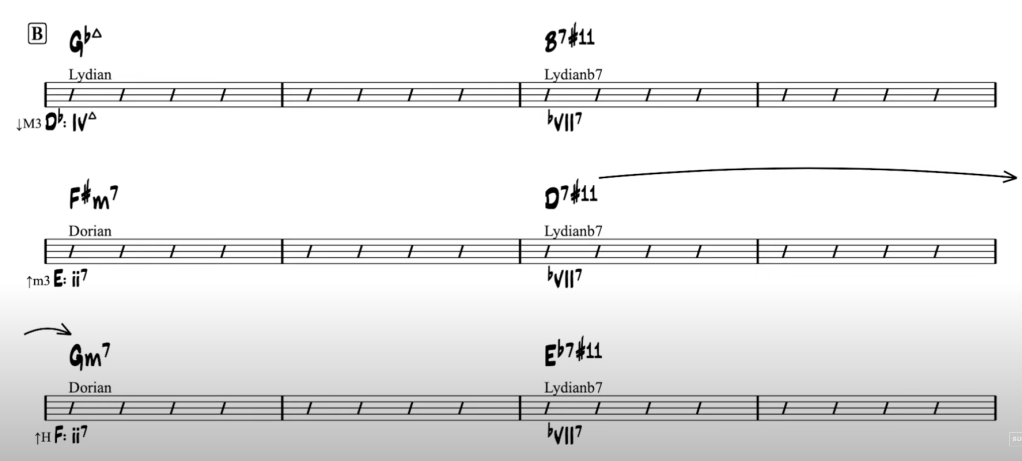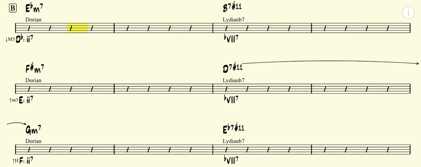 So, if we consider these three dominant chords in the B section as bVII7 chords, then they should all be paired with the lydianb7 scale, becoming 7#11 chords. By reharmonizing the Gbmaj7 in the first measure of the B section with an Ebm7 dorian, we now have an entire sequence of iim7 to bVII7 chords. Ebm7 to B7#11 is a ii – bVII7 in the key of Db. Modulating a minor third up gets us to F#m7 to D7#11, also a ii – bVII7, but now in the key of E. And if we modulate again, a half-step up, we get Gm7 to Eb7, which is also a ii – bVII7, only back in the original key of F major.